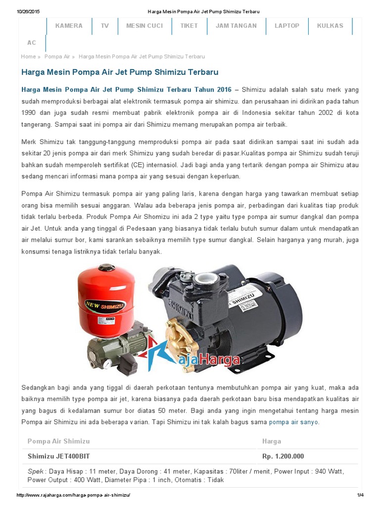 Mesin pompa sudah jadi peralatan elektronik yang wajib dimiliki masyarakat perkotaan. Banyak masyarakat beralih menggunakan mesin pompa air karena terkadang air yang disediakan pdam. Mesin pompa air jet pump shimizu pc 268 bit original + tabungrp1.675.000 Pastikan sesuaikan dengan kebutuhan anda. Mesin pompa air dengan daya listrik 100watt (400watt daya listrik start awal) dan daya hisap maksimal mencapai 11 meter. Jet pumps dp 82 m polos. Hanya ada satu lubang pipa hisap (input) dan satu lubang pipa buang (output). Shimizu juga menciptakan sebuah jet pump, yang salah satunya adalah shimizu pc 375 otomatis non tabung. Jet pumps dp 82 m polos; Sangat cocok di pakai untuk menyedot air dari tanah, sumur atau sumber lain seperti pam. Pompa air elektrik high pressure 12v 70psi 3.5l/min. Anda sudah mencapai jumlah maksimum produk dalam wishlist. Ternyata yamaha juga memproduksi mesin pompa air, lho!